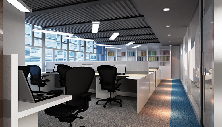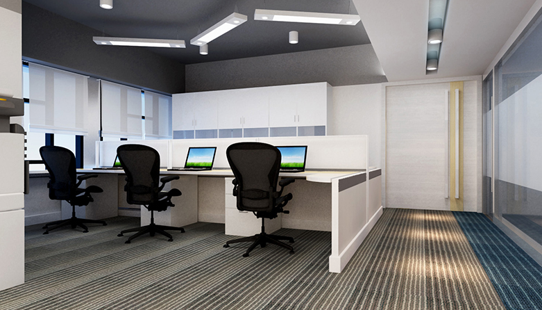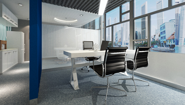 本方案是LOFT雙層的辦公空間,總層高為5.2m,單層面積150m2, 在入口門廳處做了挑空的共享空間,使得不大的辦公空間顯得連貫流暢,其他空間為鋼結構夾層,充分利用了空間,為業主營造了盡可能多的使用面積;前臺背景墻以帶有折面造型的豎向格柵條裝飾,以線成面,面中帶有肌理,和天花板中淺藍色燈帶互應,體現現代化的辦公氣氛。