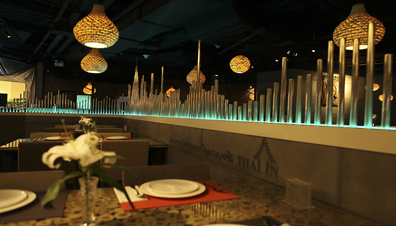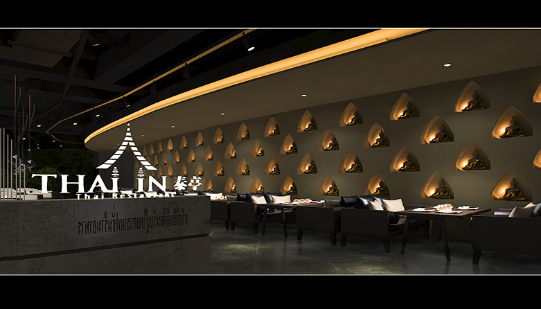 以現(xiàn)代的木質(zhì)和簡潔化設(shè)計結(jié)合,突出泰式餐廳的優(yōu)雅和時尚,不銹鋼管制的泰國剪影,深色調(diào)的穿孔鋼板造型,優(yōu)雅的泰國風(fēng)景抽畫,鐵藝的小型燈具,無一不體現(xiàn)出設(shè)計的獨特和品味,以現(xiàn)代感的空間配搭優(yōu)雅的泰式茅臺,創(chuàng)意非凡。